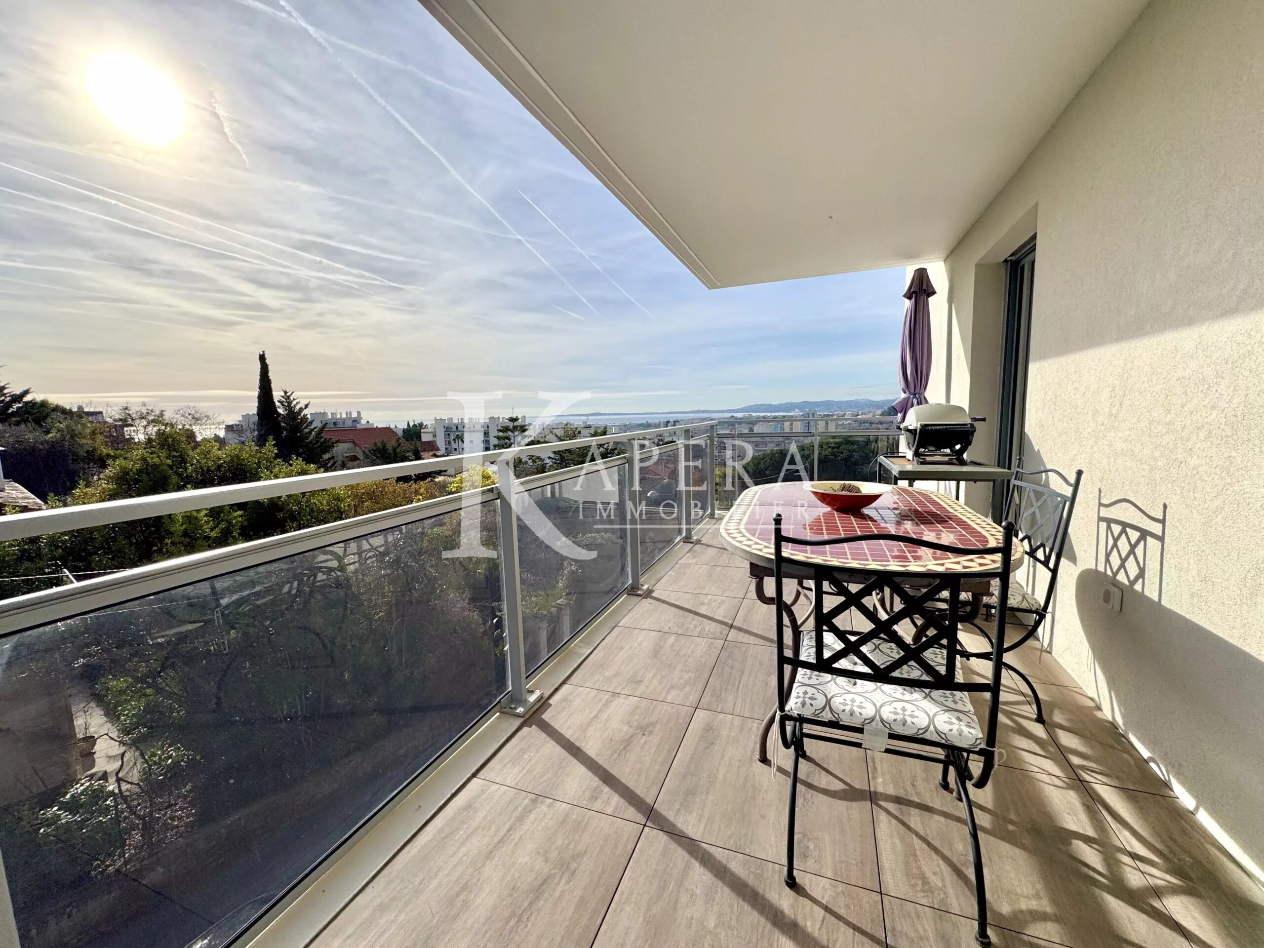 Dans un quartier résidentiel paisible, à seulement 10 minutes de la Promenade des Anglais, lumineux 3 pièces de 60m2 en étage élevé avec deux terrasses, vue panoramique à 180°, piscine et garage.