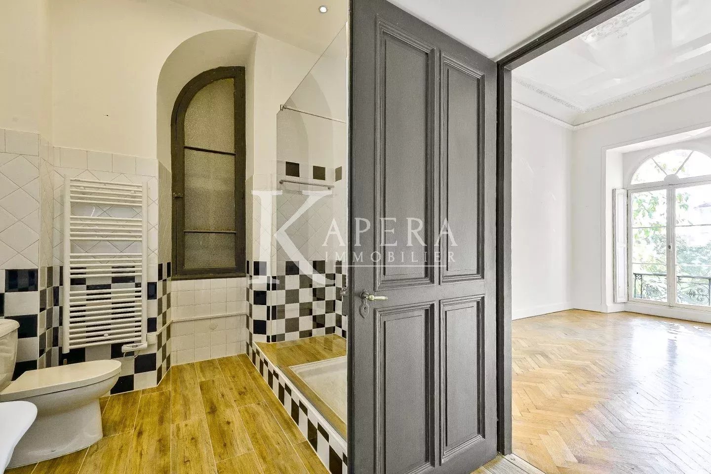 Situé en rez-de-chaussée surélevé (là où se trouvaient les anciennes salles de réception), ce splendide quatre pièces vous séduira par ses vastes pièces parquetées en enfilade, ses portes majestueuses et ses sept immenses fenêtres baignées de lumière avec vue sur les jardins.