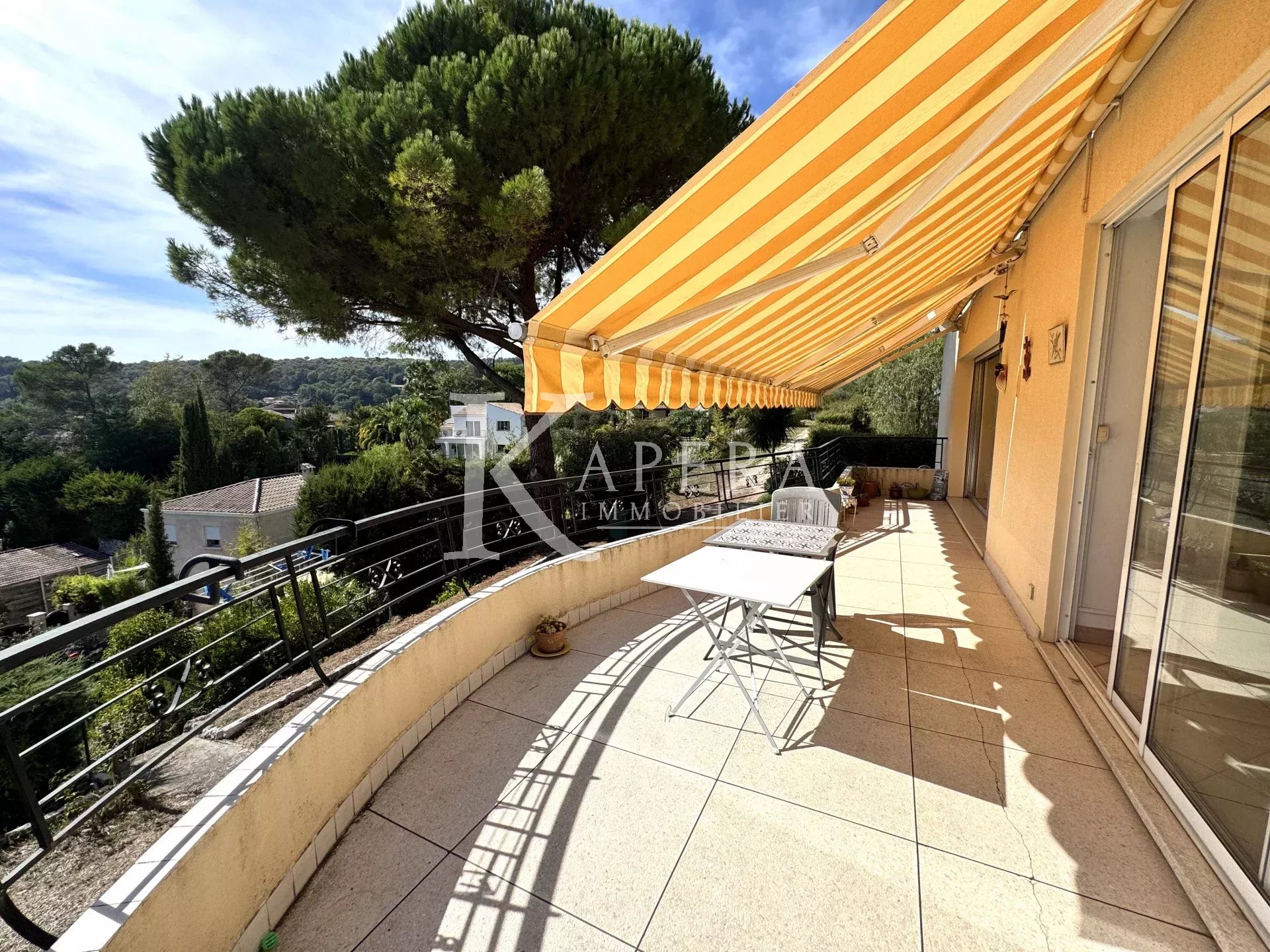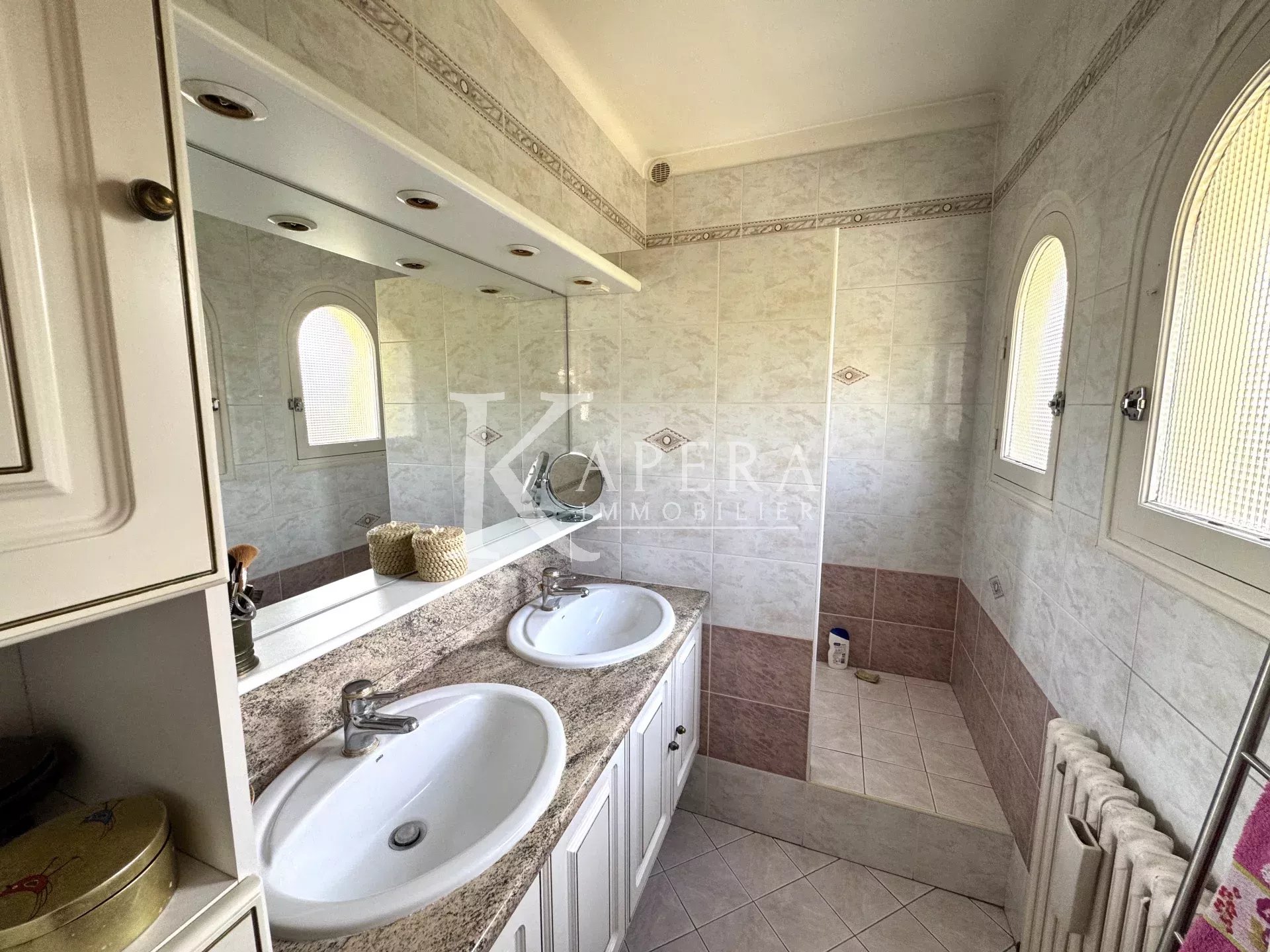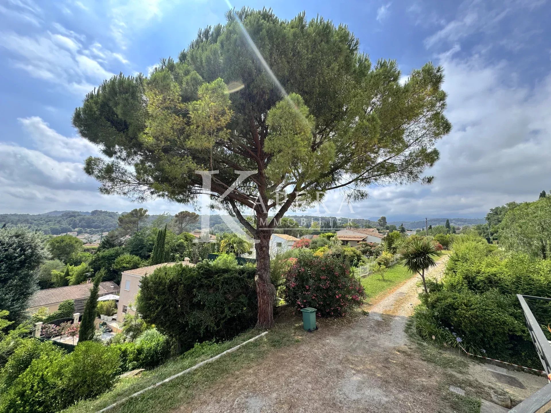 À l’étage, une spacieuse entrée s’ouvre sur un grand salon/salle à manger donnant accès à une belle terrasse d’environs 36m2, offrant une vue dégagée sur la verdure et un pin majestueux.