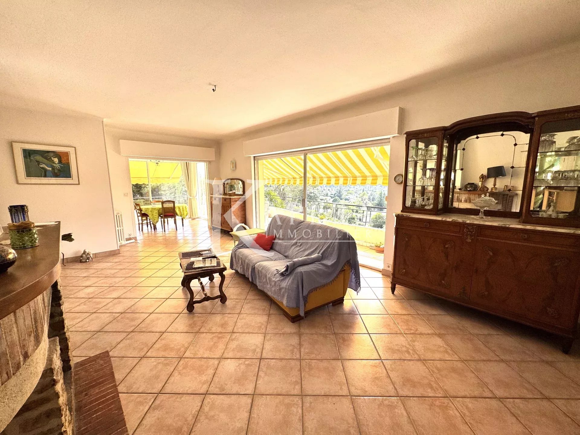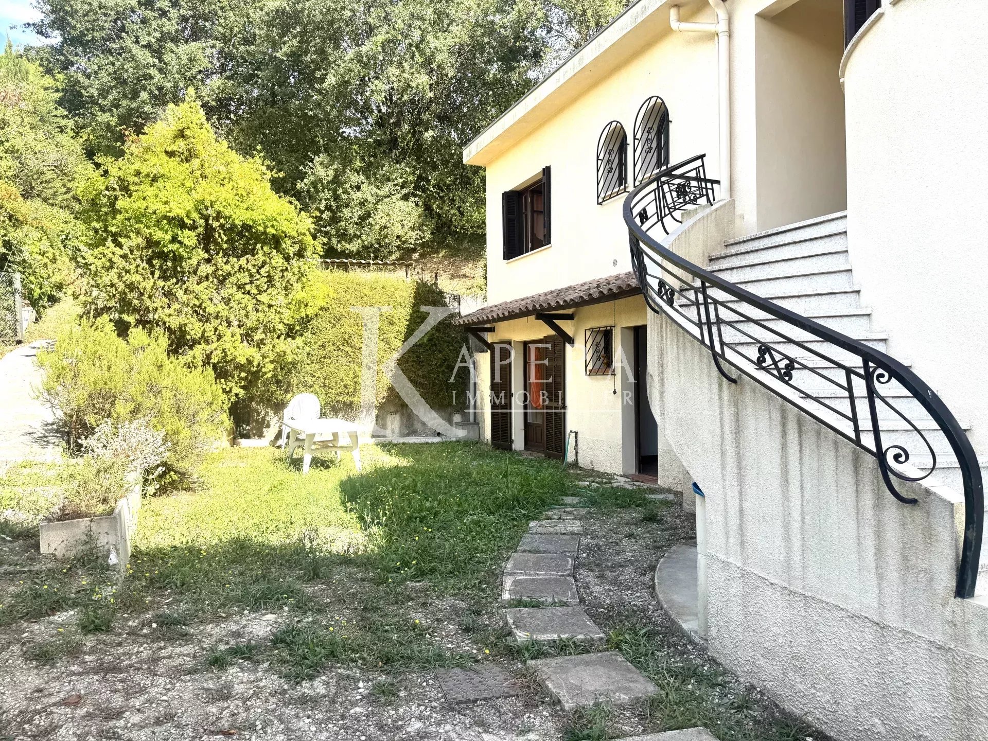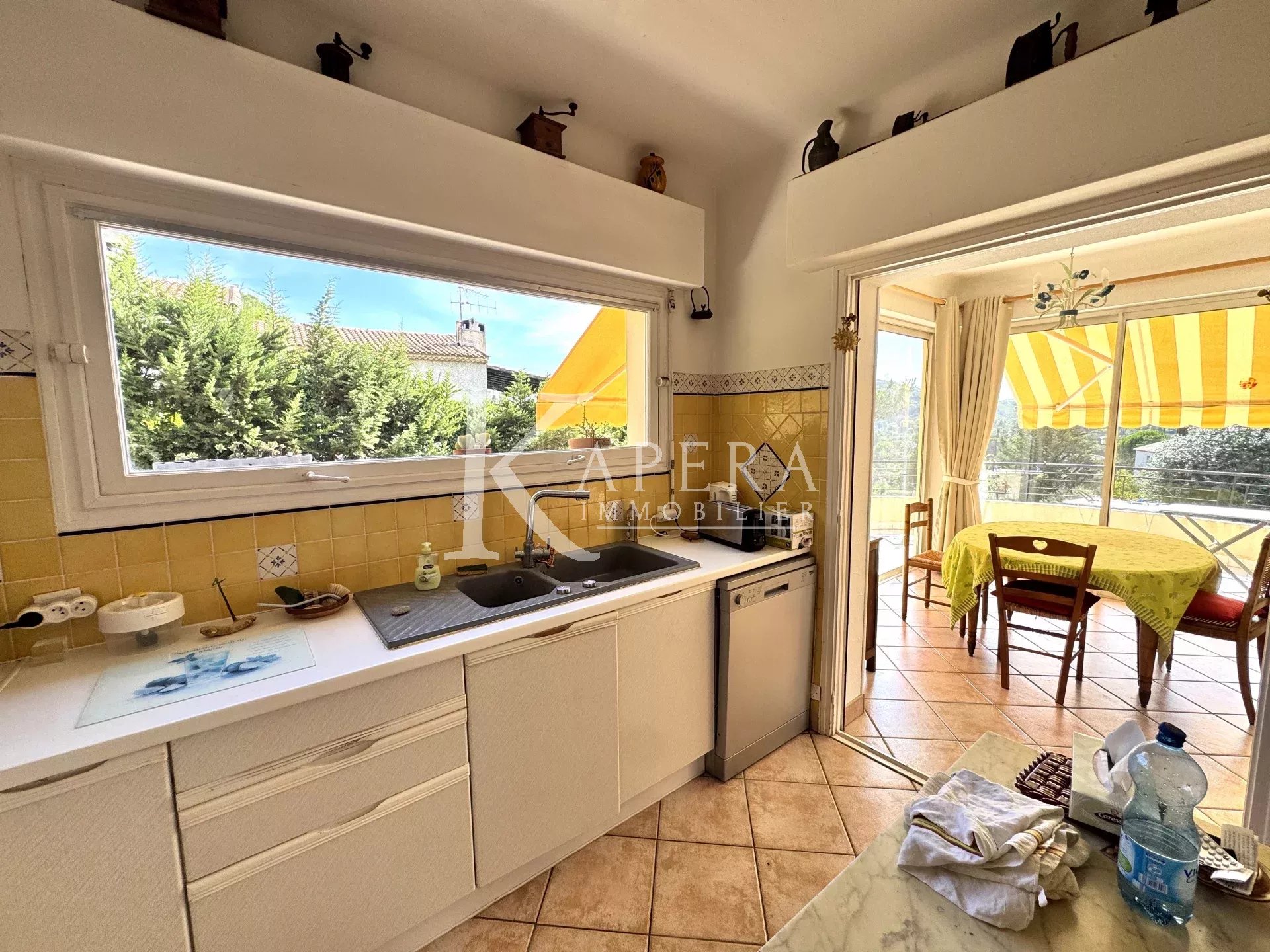 À l’étage, une spacieuse entrée s’ouvre sur un grand salon/salle à manger donnant accès à une belle terrasse d’environs 36m2, offrant une vue dégagée sur la verdure et un pin majestueux.