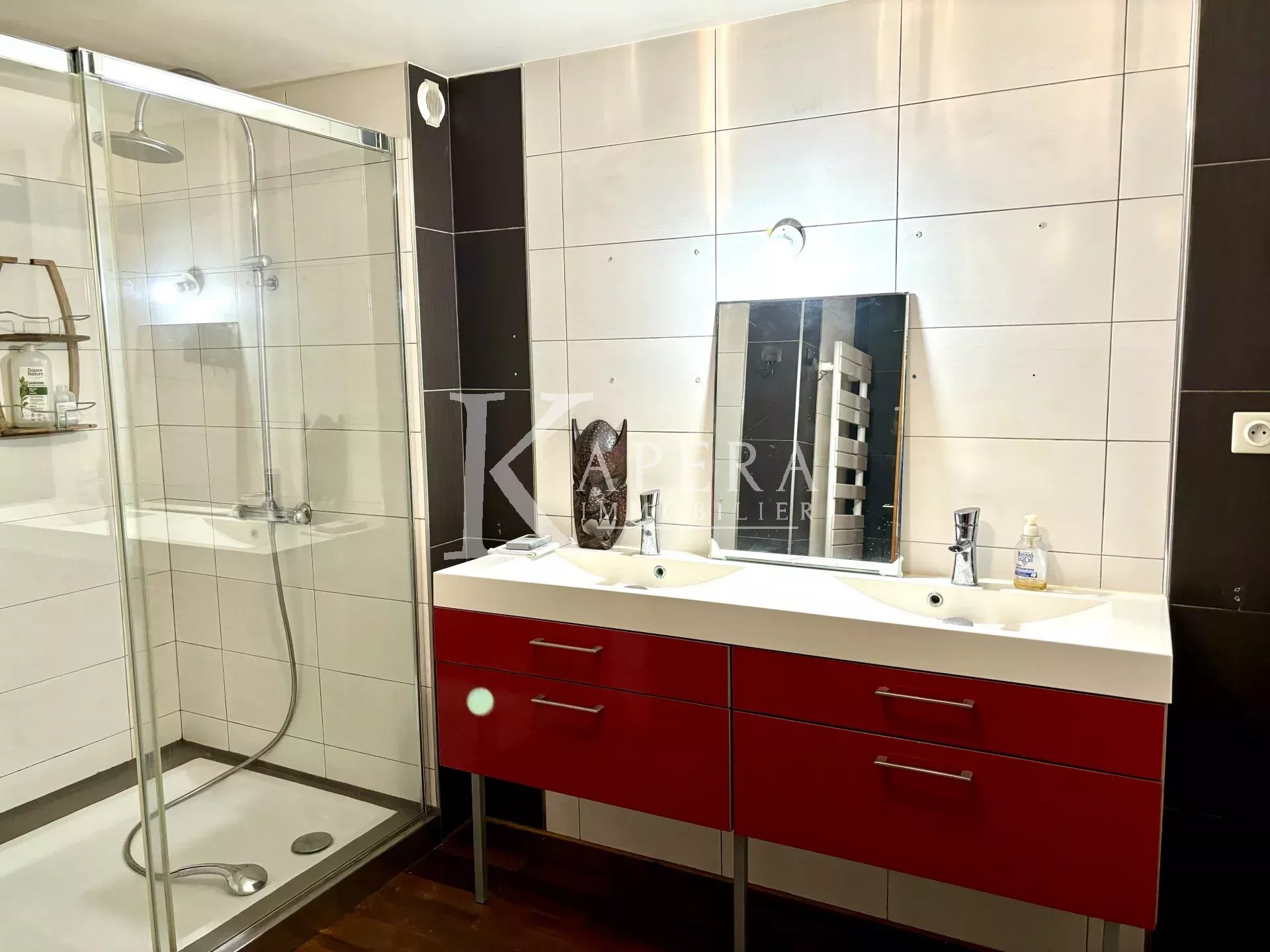 A l’étage : un grand espace modulable avec cuisine équipée, salle de douche et WC.